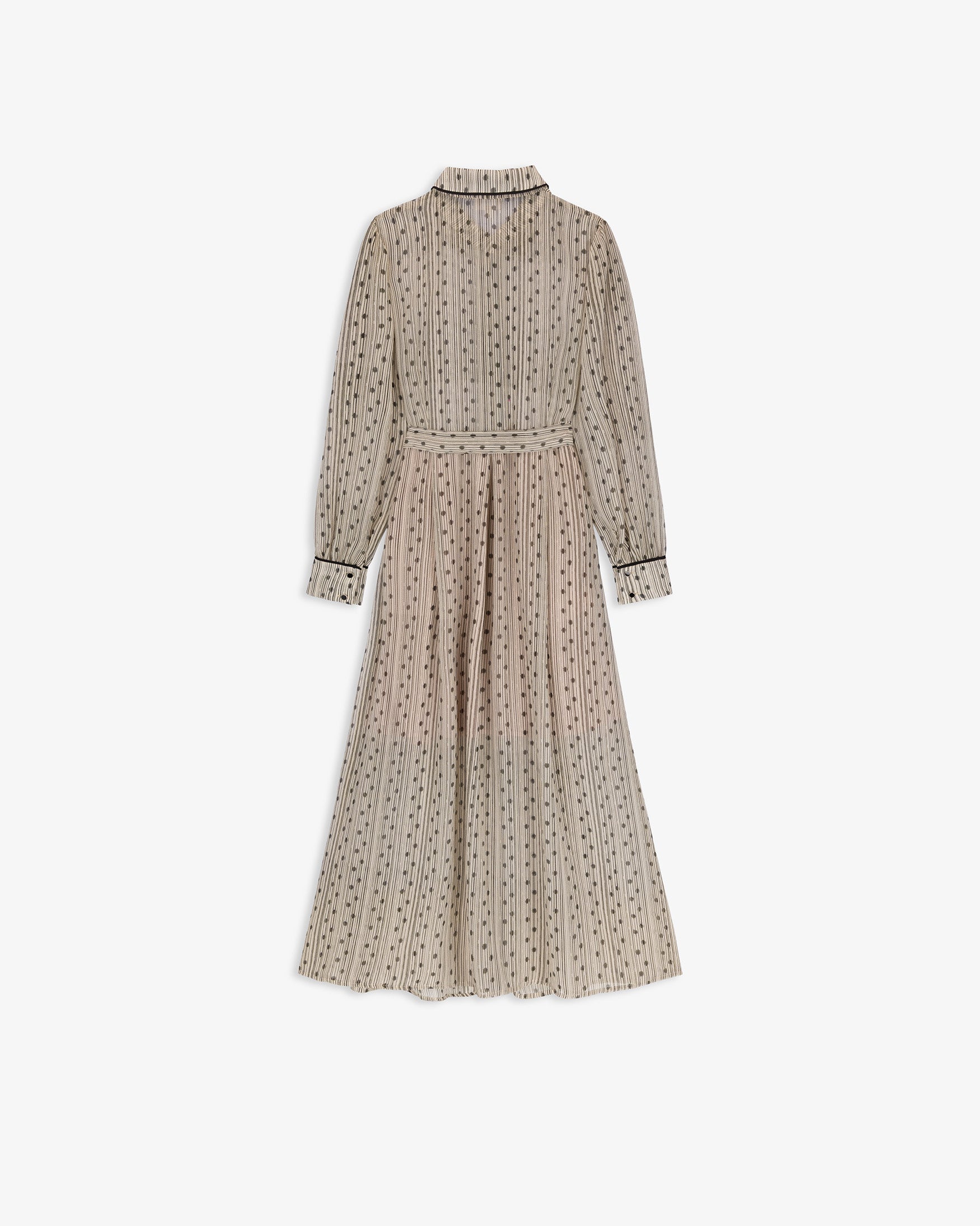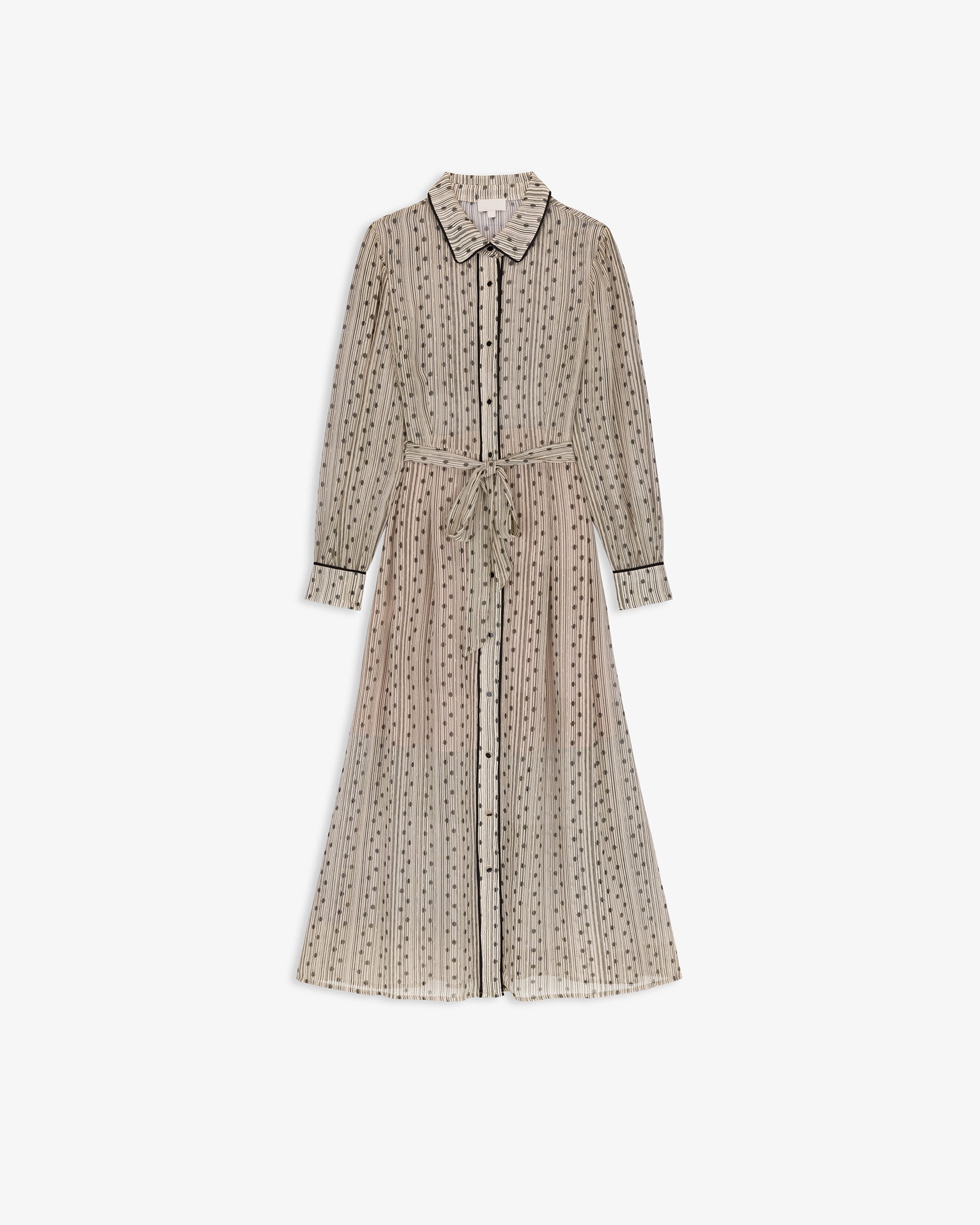 Vestido de cuello solapa y manga larga acabada en puño. Detalle de vivos combinados a contraste. Cinturón lazada en mismo tejido. Cierre frontal con botones.