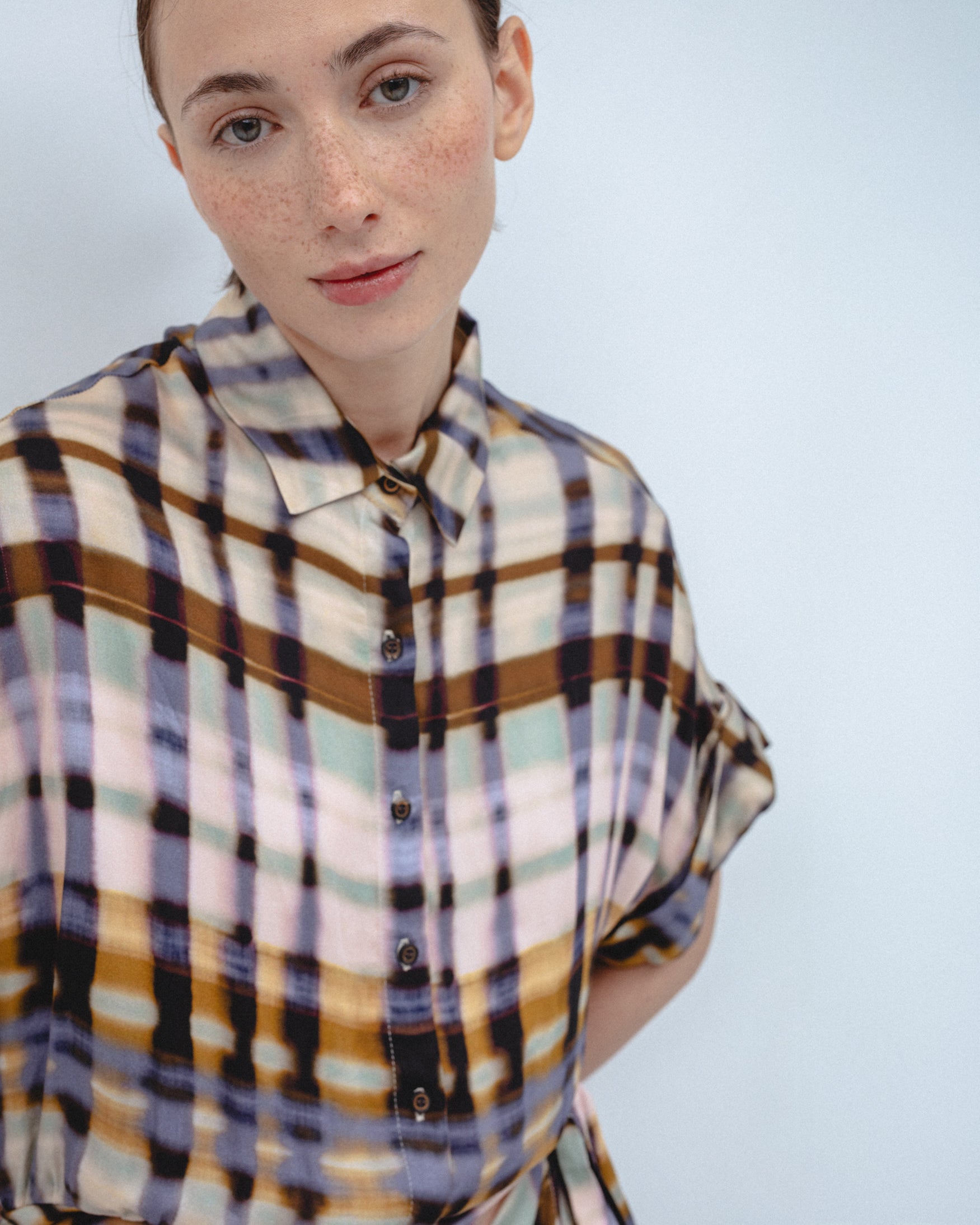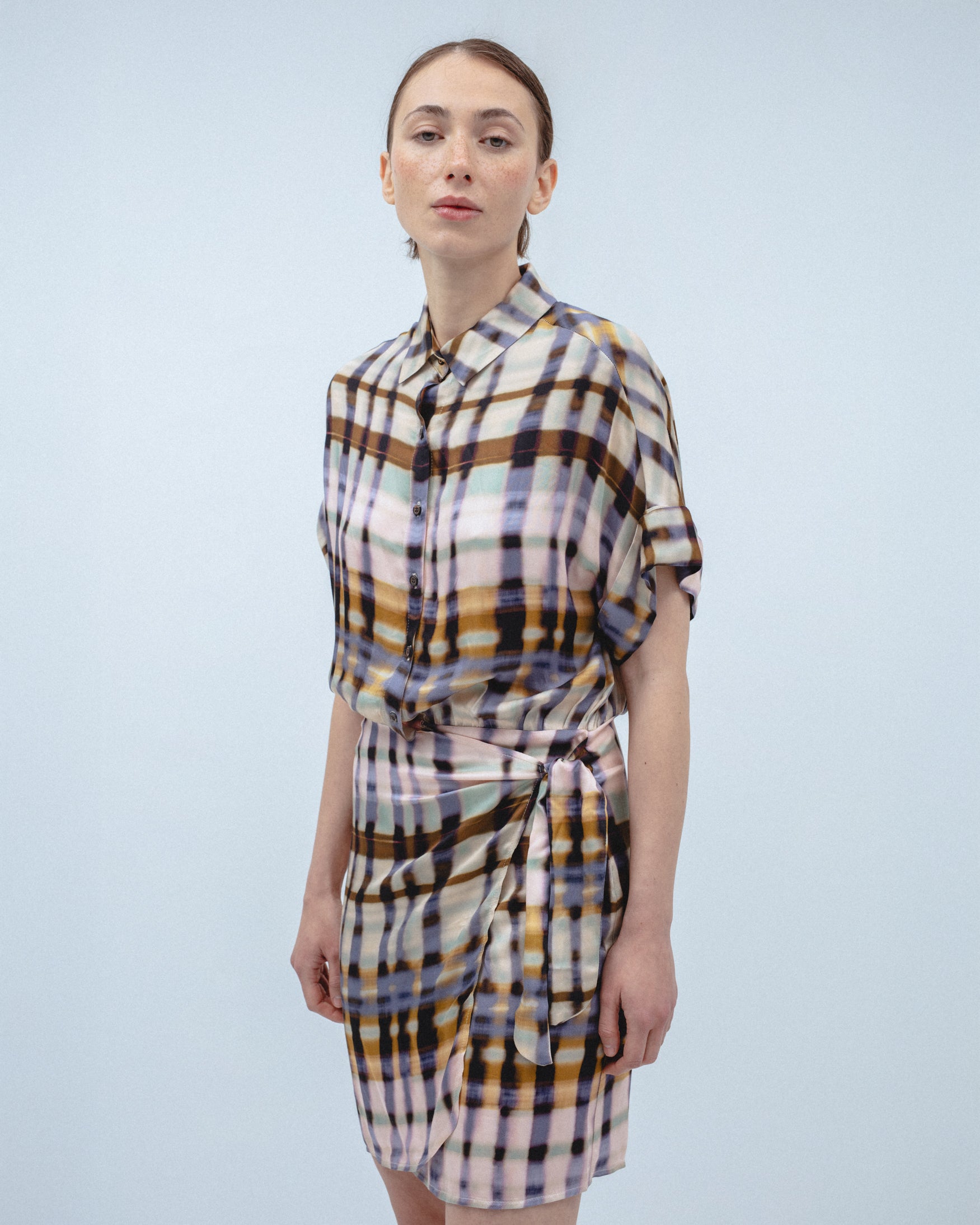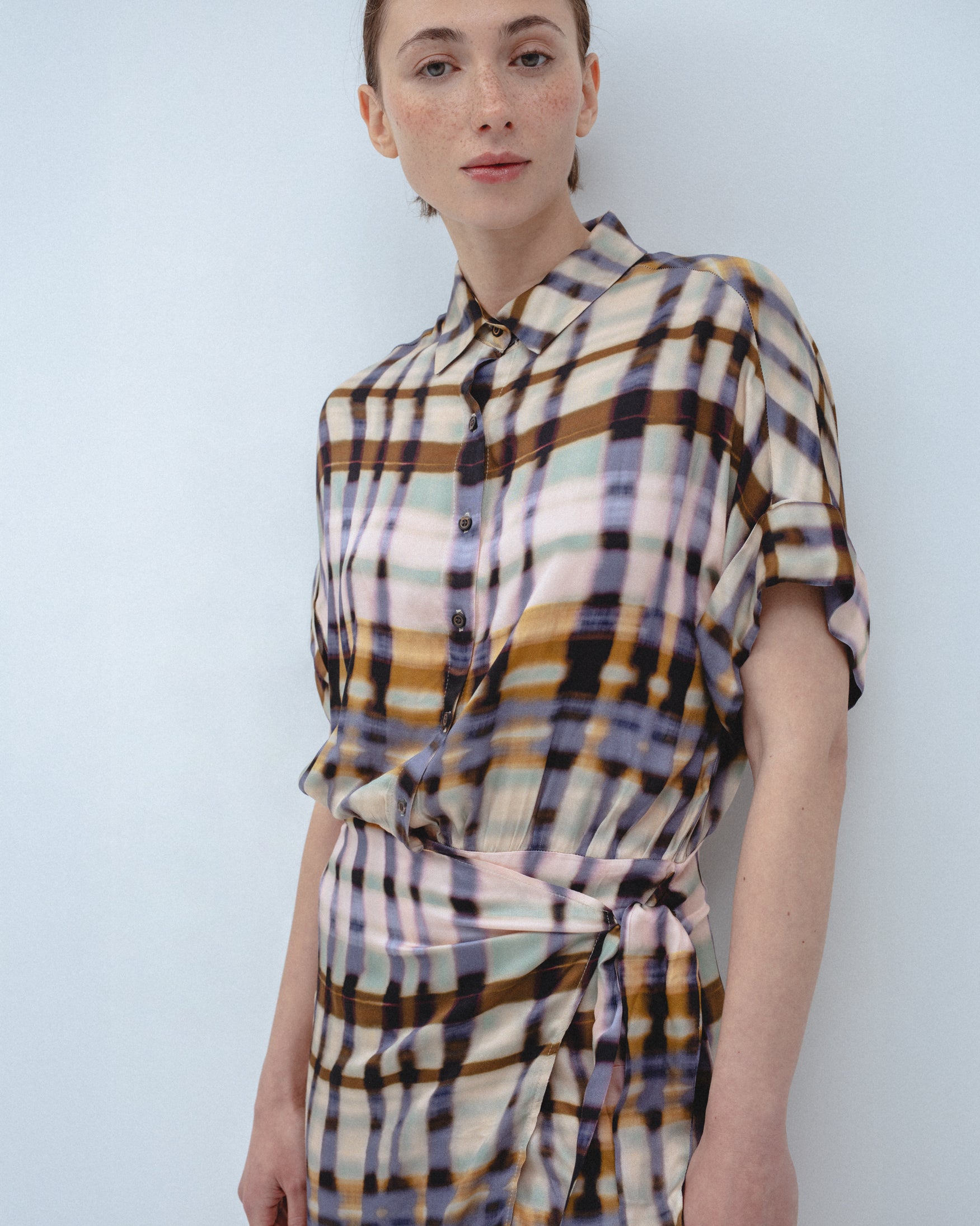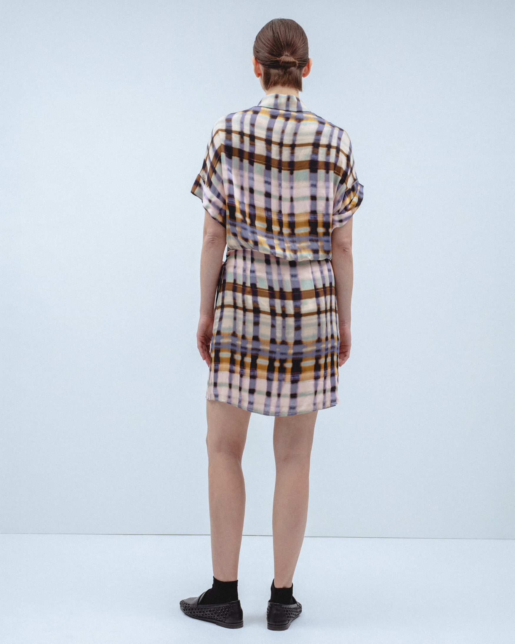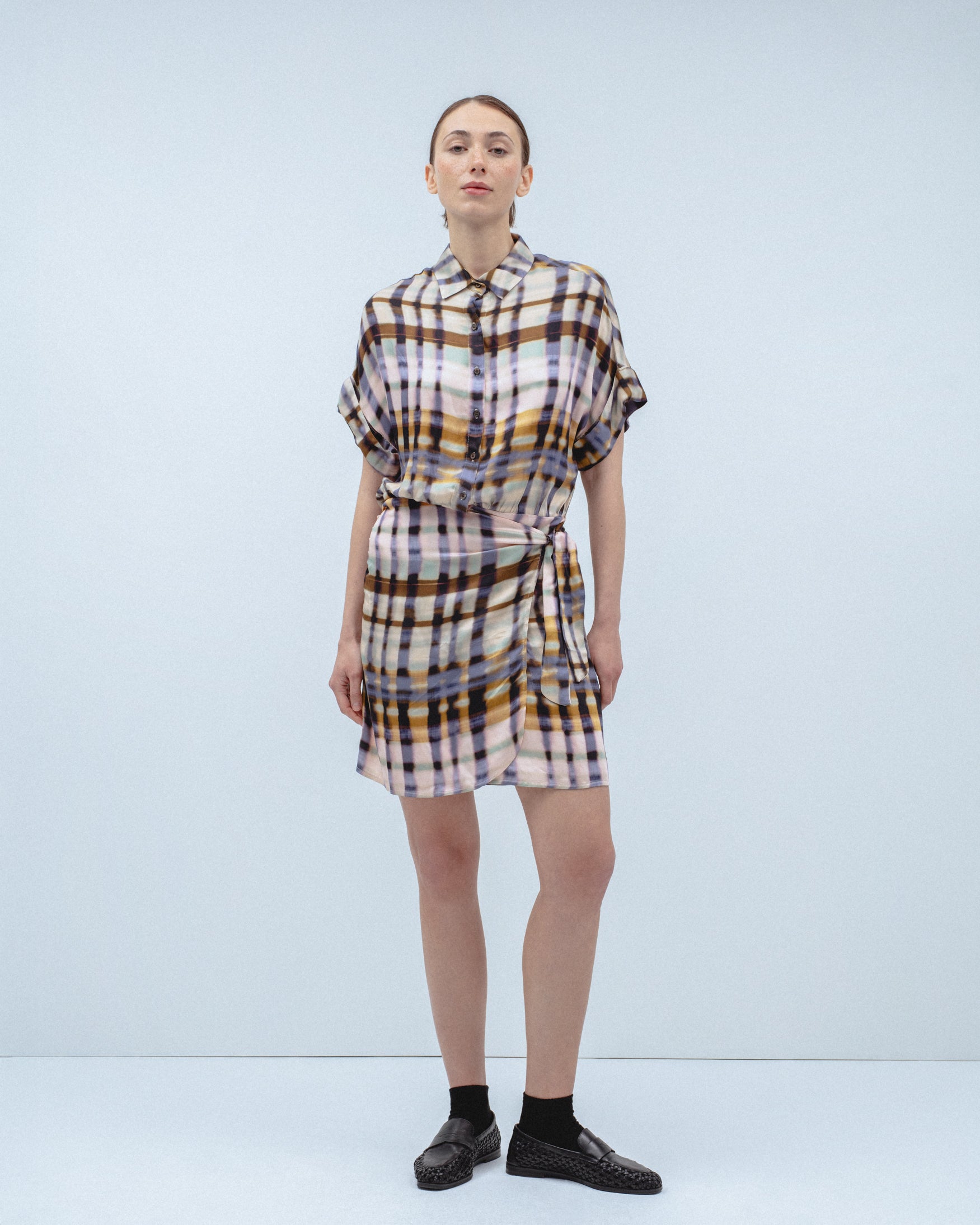 Vestido corto de cuello solapa y manga corta acabada en vuelta. Detalle de tejido drapeado en cintura con lazada tipo pareo en el mismo tejido. Cierre frontal con botones.