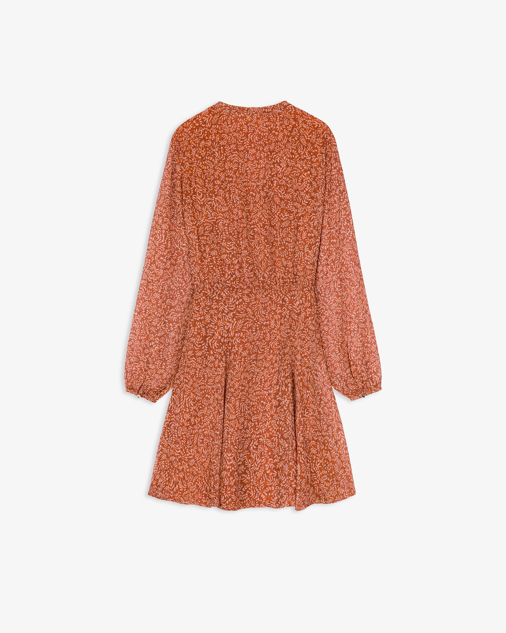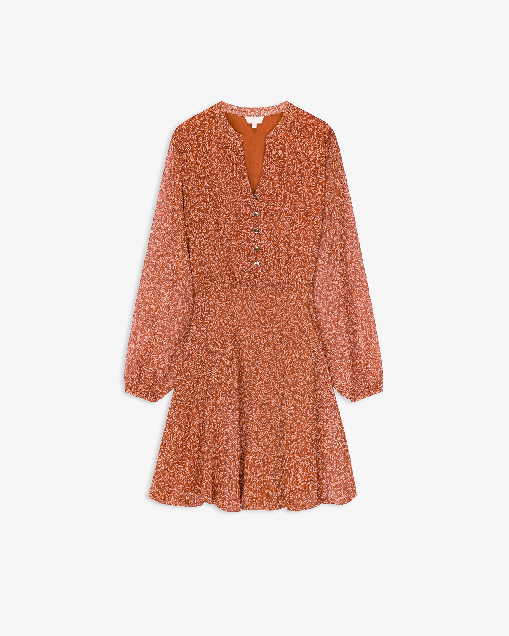 Vestido corot de escote pico y manga larga acabada en elástico. Detalle de cintura elástica. Cierre frontal con botones. Estampado de mini flores.