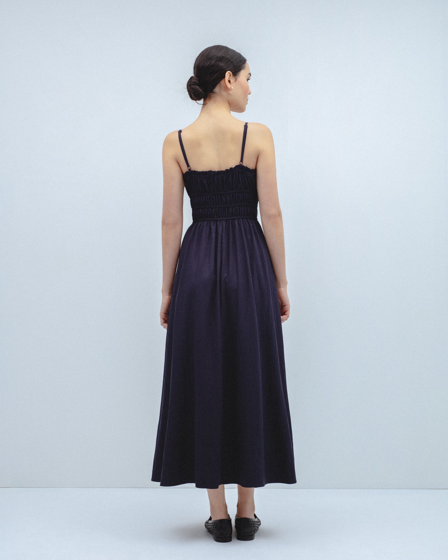Vestido largo de escote recto y tirantes finos. Detalle de cuerpo elástico tipo nido de abeja con frunces. Falda con volumen y caída fluida.
