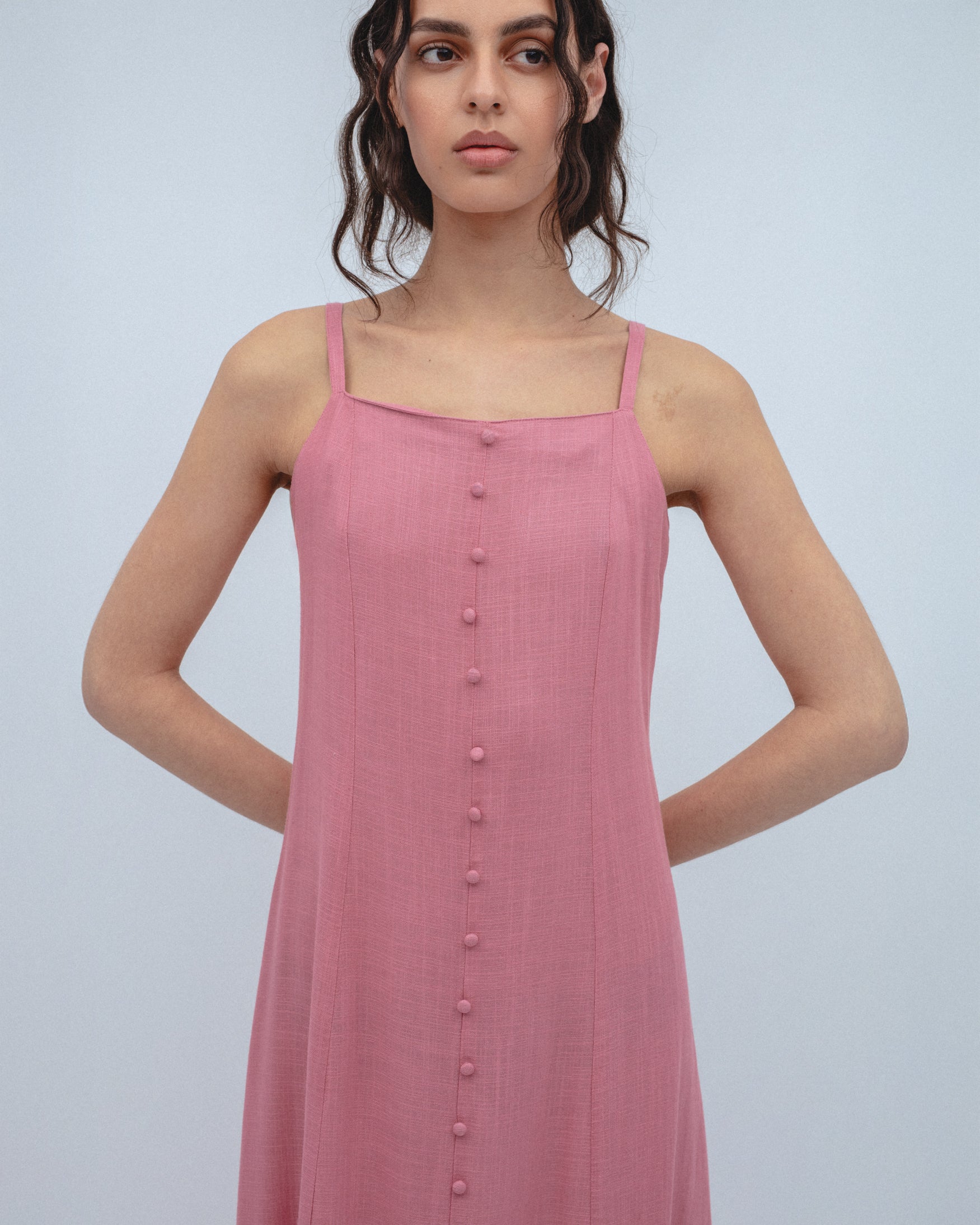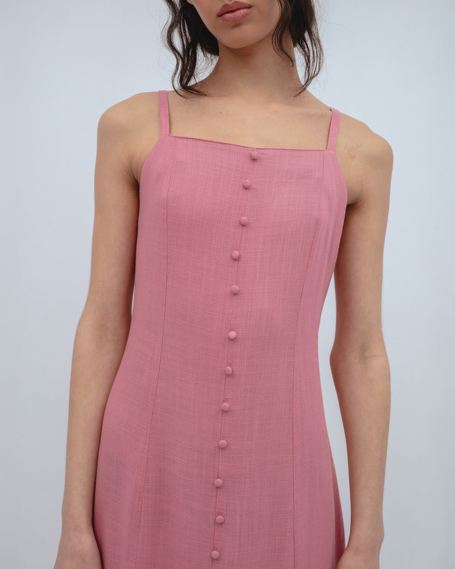 Vestido largo confeccionado en tejido con mezcla de lino. Escote recto y tirantes finos. Detalle de falsa botonadura frontal con aforrados en mismo tejido. Bajo acabado en abertura frontal central. Cierre en espalda con cremallera oculta en costura.